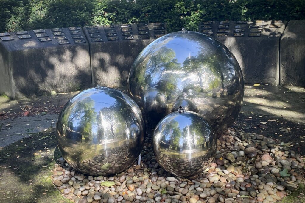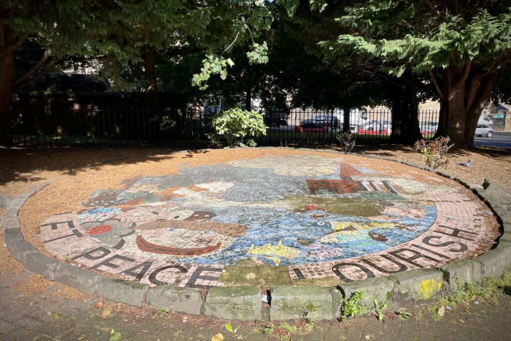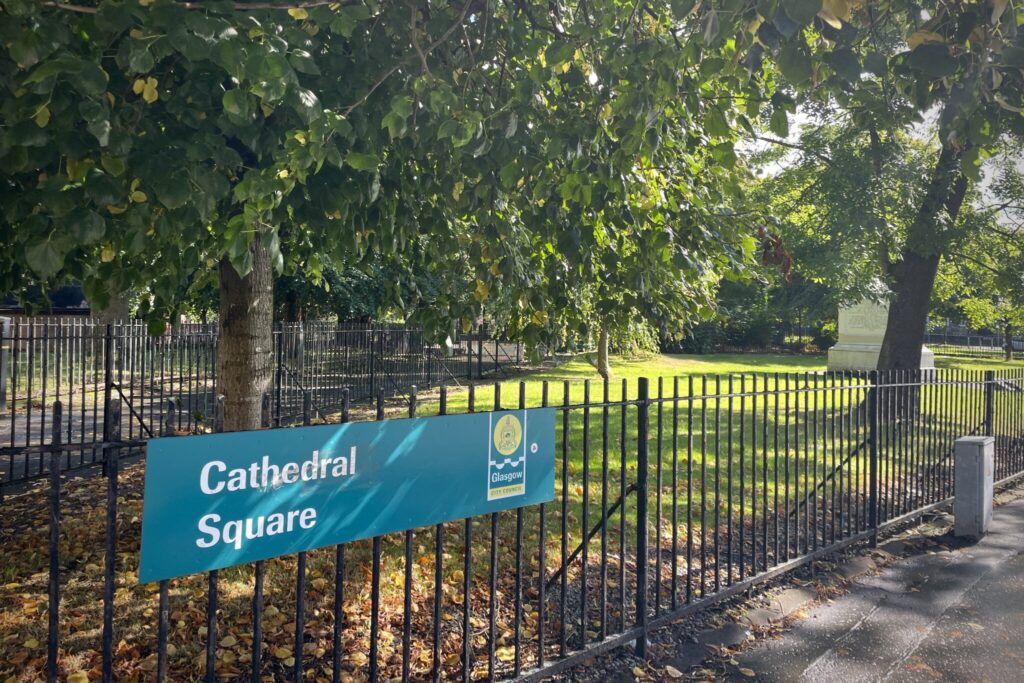 A city square with a cross shaped path and some seating in the centre. Of the four garden areas only one is open to the public and this contains ‘The Infant Memorial’, a place to remember babies cremated at Daldowie and Linn crematoria. In one of the other quarters stands a statue, almost 300 years old, of King William of Orange. (16/09/25)