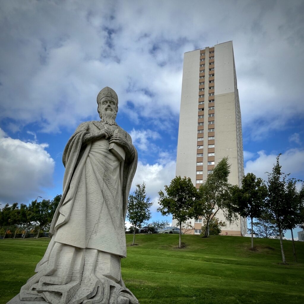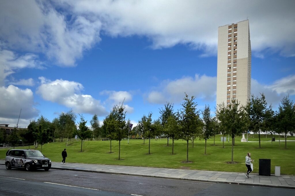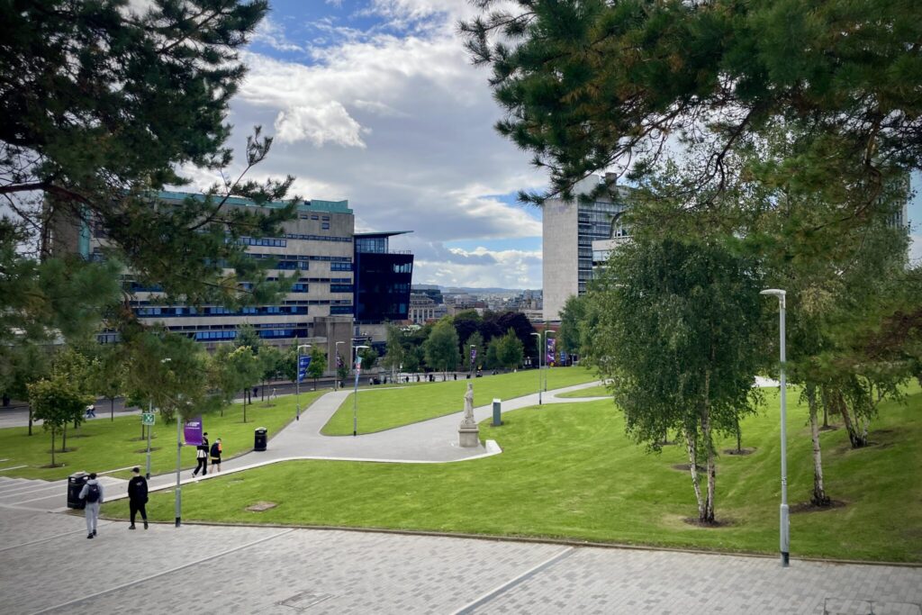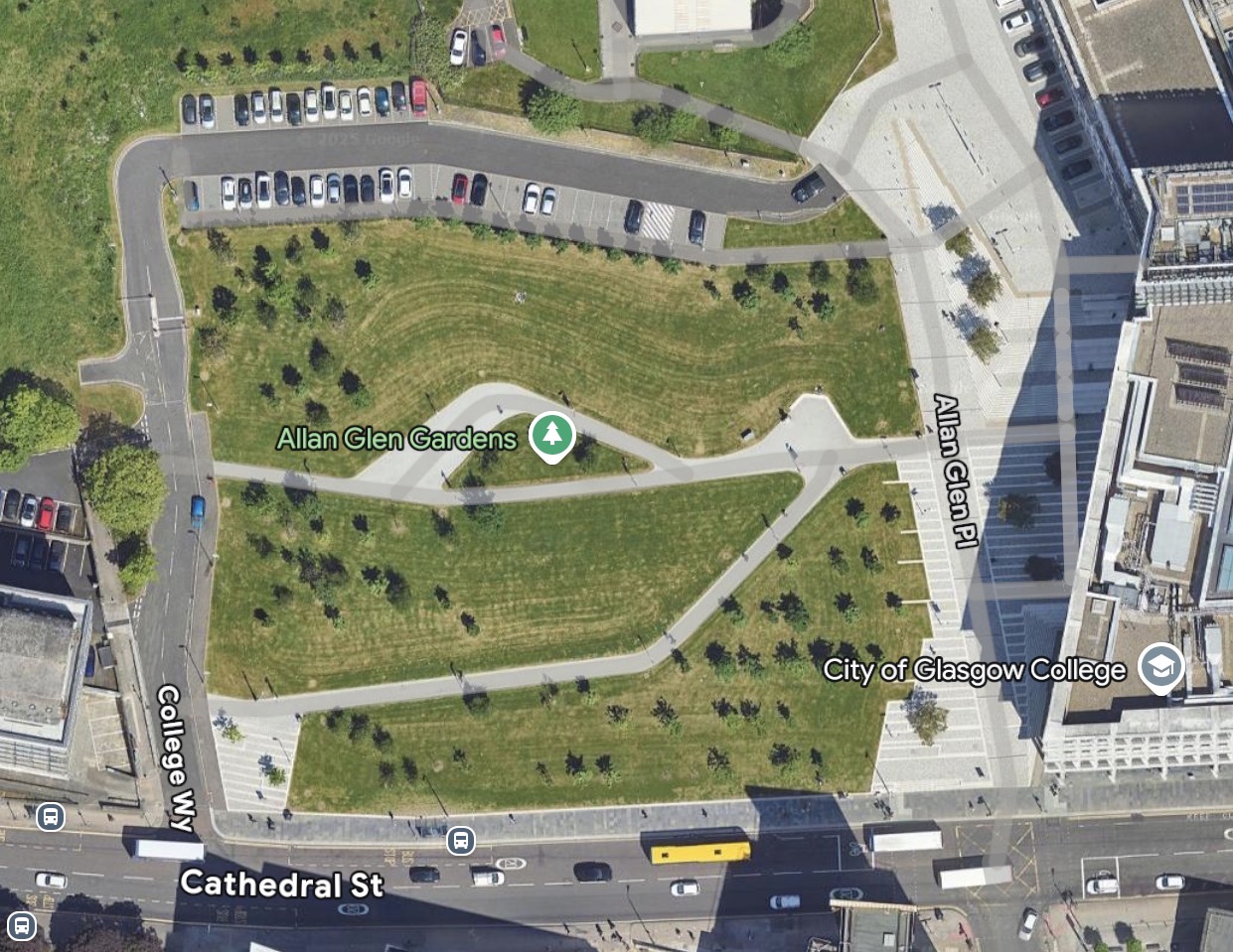 A modern green space on a sloping and terraced hill, with a statue of St Mungo. The park was built as part of the new City of Glasgow College Campus. Some maps have this as Alan Glen Gardens but I could find no mention of this naming online. (16/09/25)