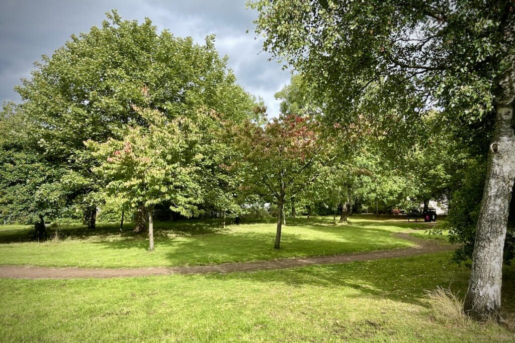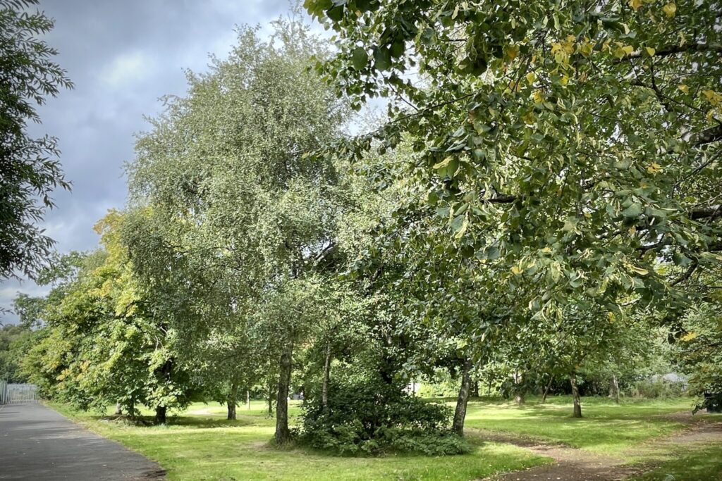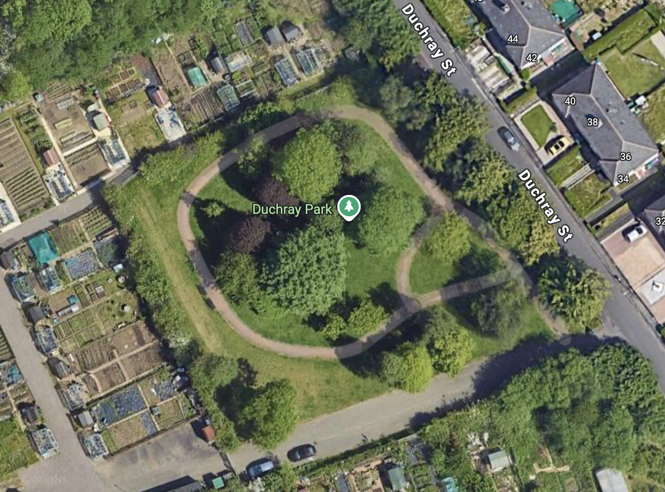 A small park hidden away in a corner of Riddrie with some mature trees and a single circuit path. The park is surrounded on three sides by allotments. (10/09/25)