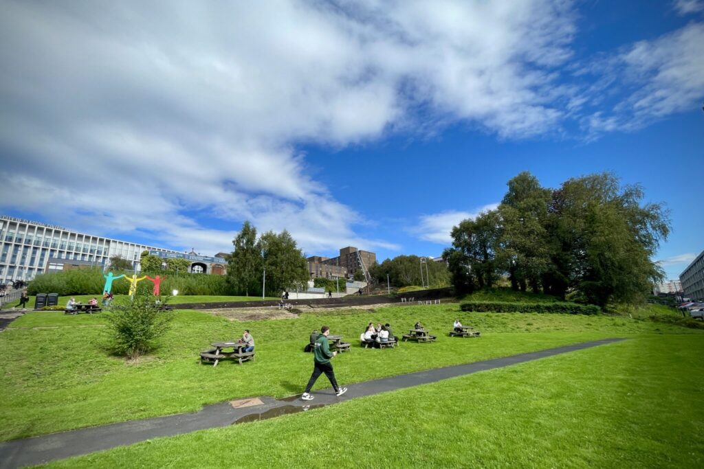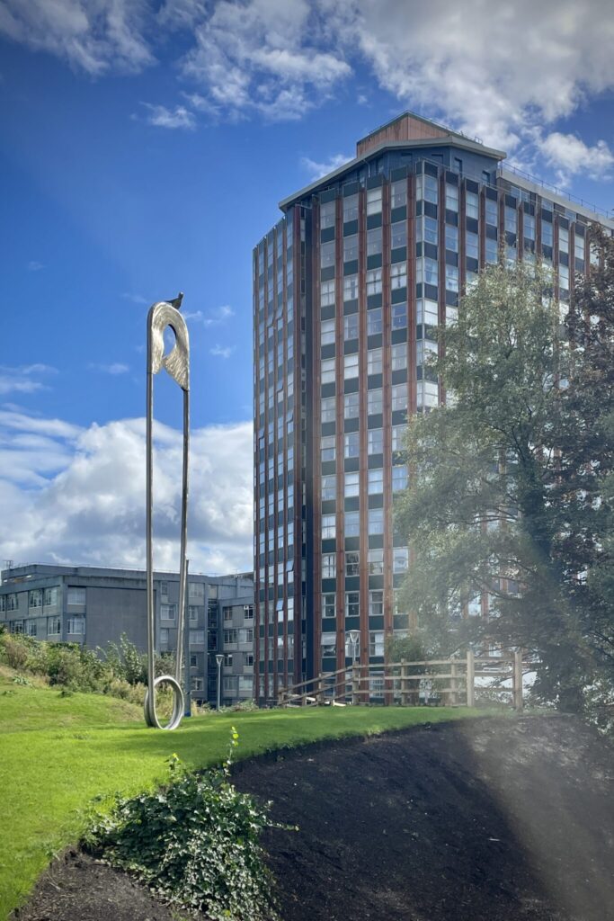 One of Glasgow’s newer city parks, built on the location of Glasgow Maternity Hospital which was closed in 2001. Just 400m from Queen Street Station this terraced park is on a steep hill. There are grassy areas with seating and paths through hedged areas where remnants of the Victorian building are displayed. Notable is the George Wylie statue of a giant nappy pin with a bird perched atop. The park is owned and surrounded by The University of Strathclyde so is popular with students.